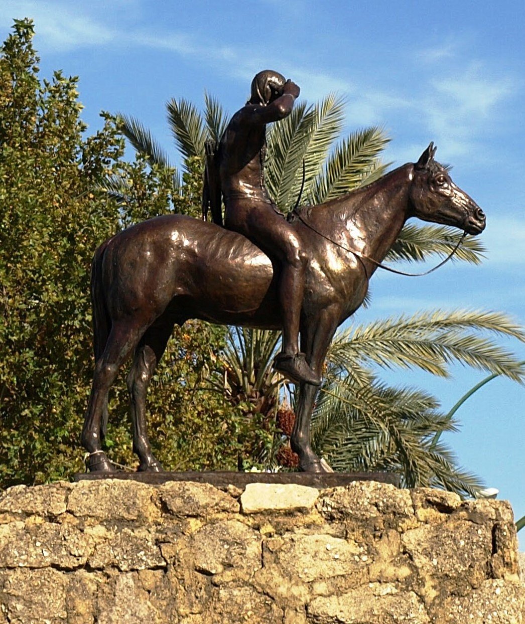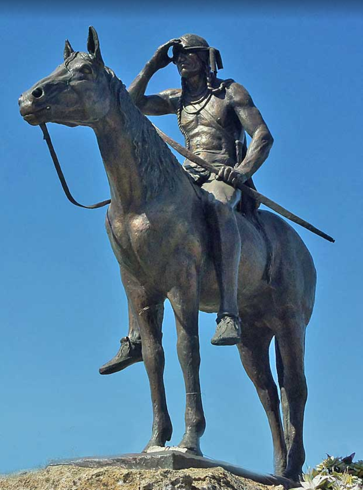 La escultura se llama "El explorador", obra del escultor estadounidense Cyrus Edwin Dallin, en un principio estuvo expuesta durante la Exposición Universal de 1992 en el pabellón de los Estados Unidos.