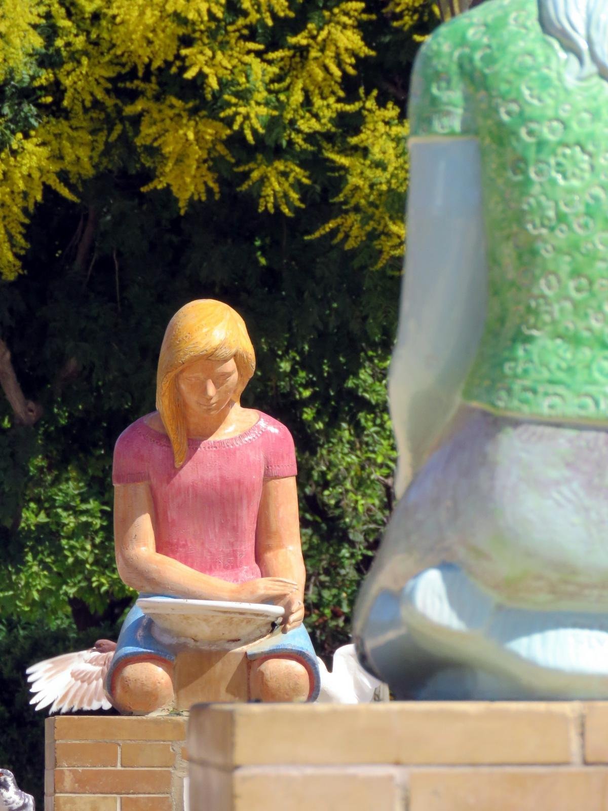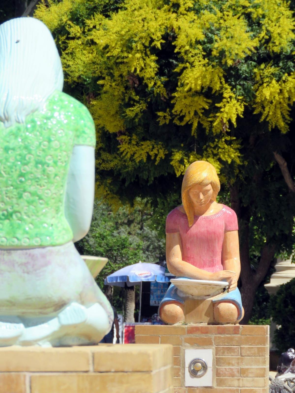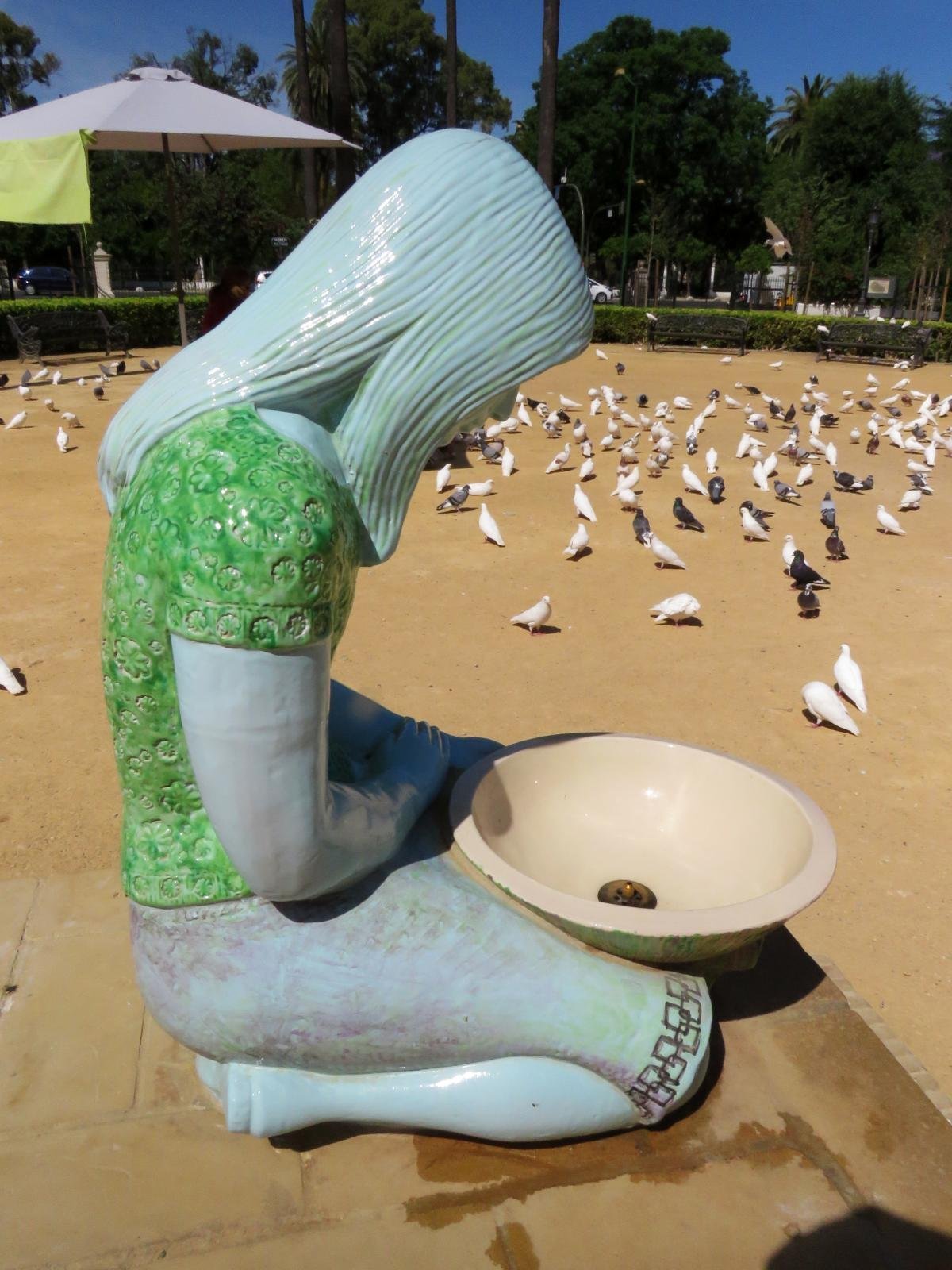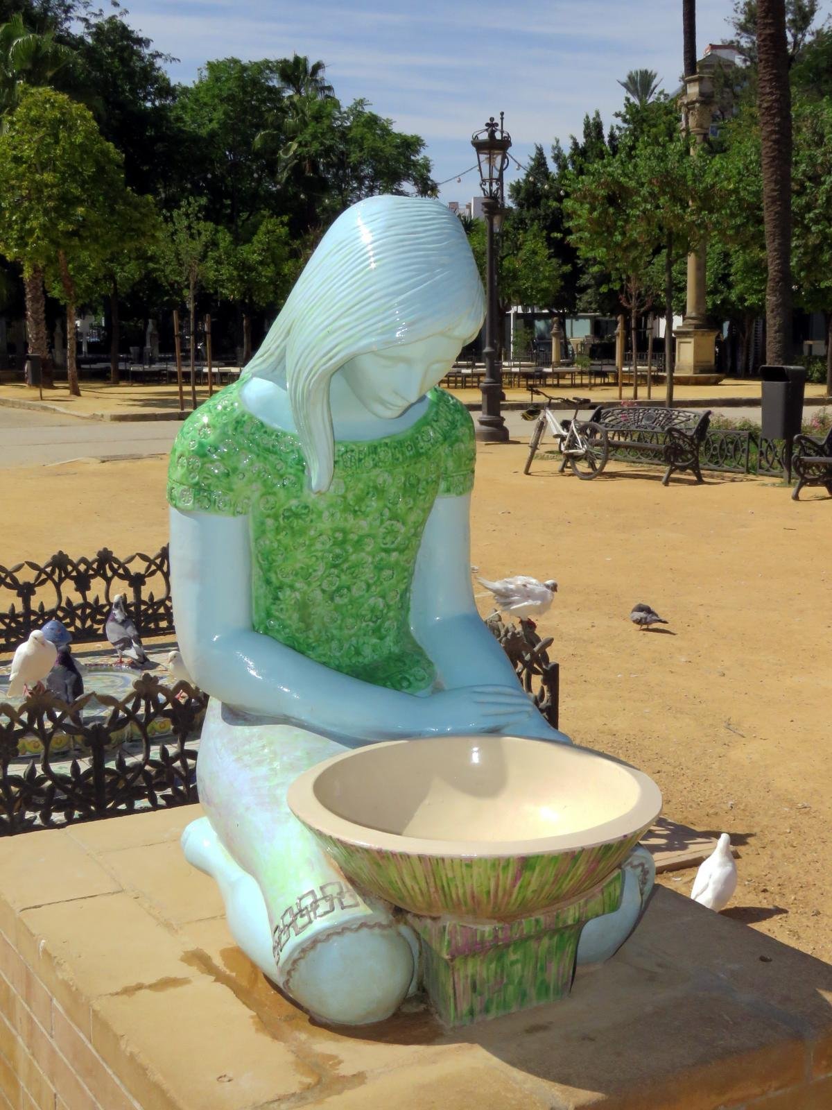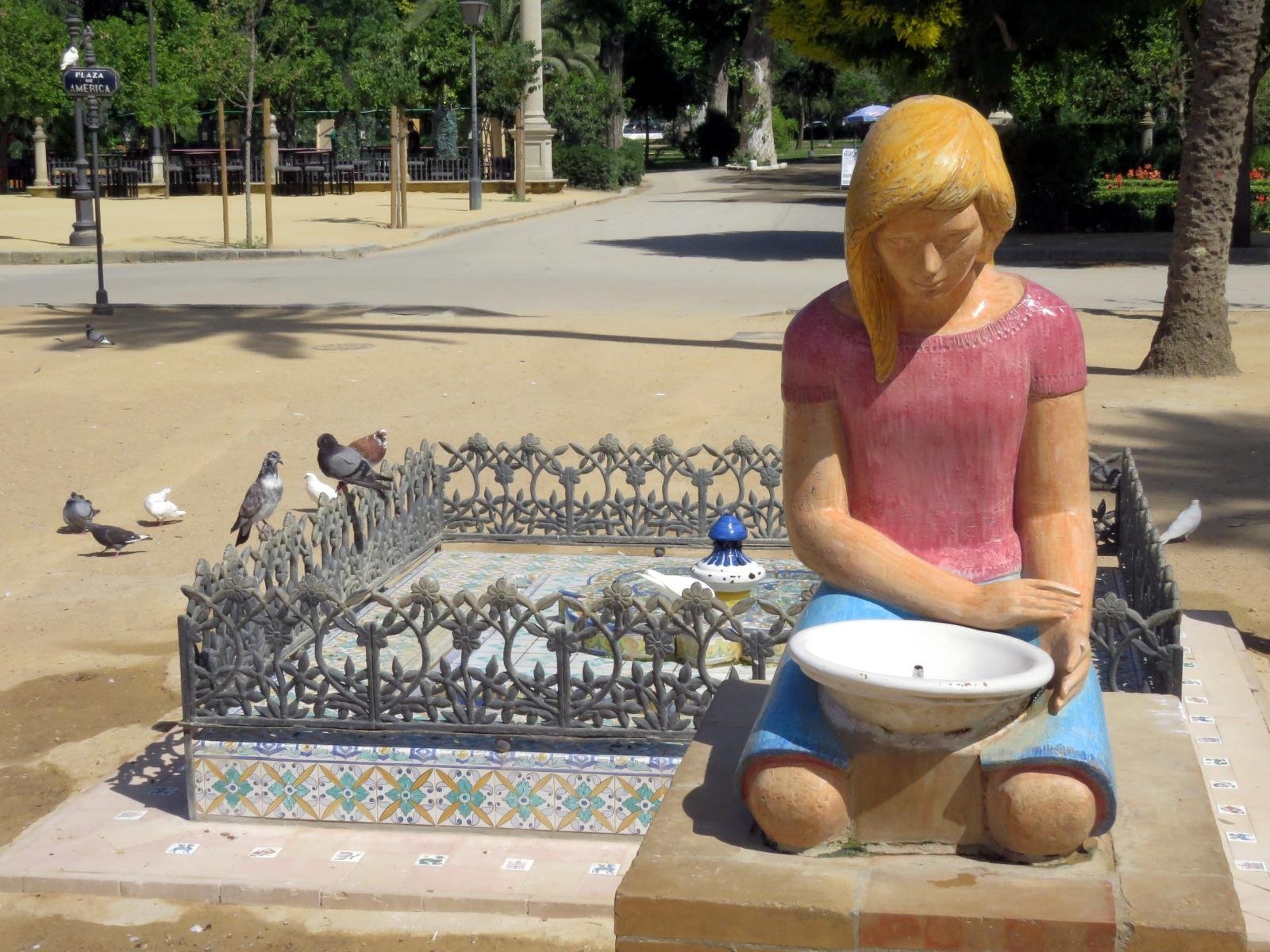El artista Juan Ramón Lafita Seva realizó en el año 1964 seis fuentes de agua potable para la Plaza de América, cuyo principal distintivo es la figura de una mujer sedente que sujeta una palangana. La presencia de estas obras se han consagrado a lo largo de los años como una estampa popular guardada en la memoria colectiva del sevillano. Realizadas en cerámica vidriada, la figura femenina tiene unos 80 centímetros de altura, 40 de lado y 50 de ancho, y cuentan un plato surtidor de 30 centímetros de diámetro.