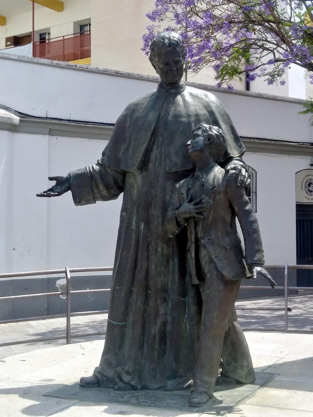 En la Calle María Auxiliadora, cerca de la entrada del colegio Salesianos Santísima Trinidad, está el monumento dedicado a San Juan Bosco, indicándole a un niño el camino hacia el centro escolar salesiano.