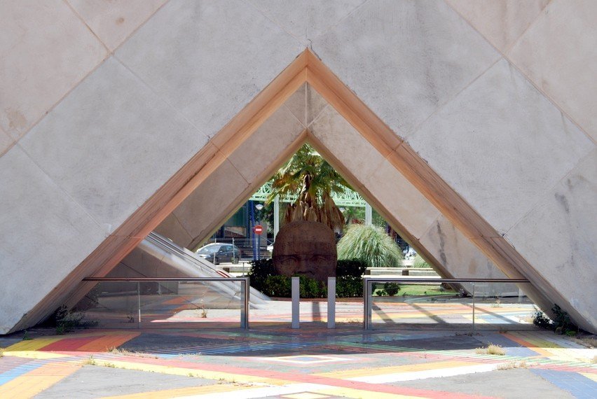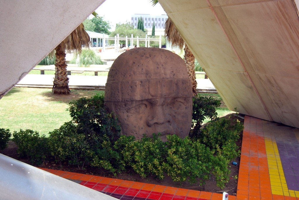 Réplica exacta de una cabeza olmeca, uno de los motivos escultóricos más representativos del arte precolombino en el ámbito de México. La réplica reproduce sus rasgos formales, así como la grandiosidad de sus dimensiones, unos 3 metros. Representa un rostro humano con casco. Está realizada en piedra artificial.