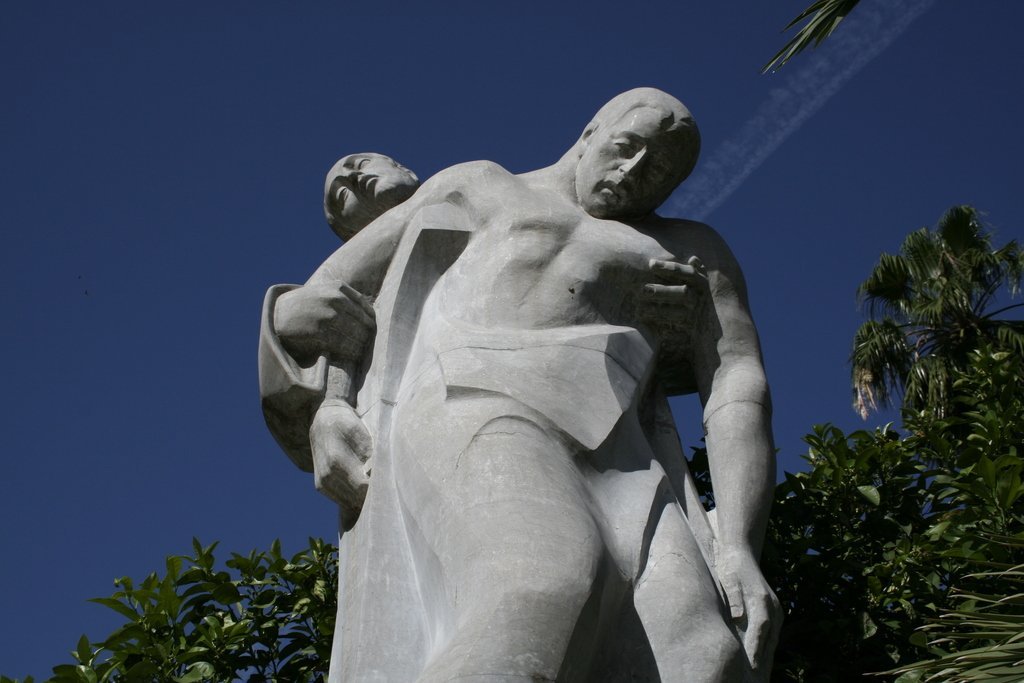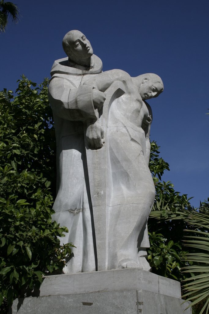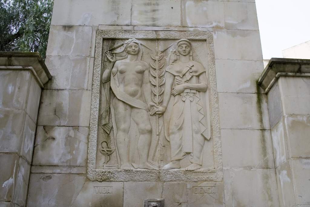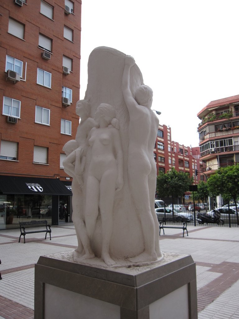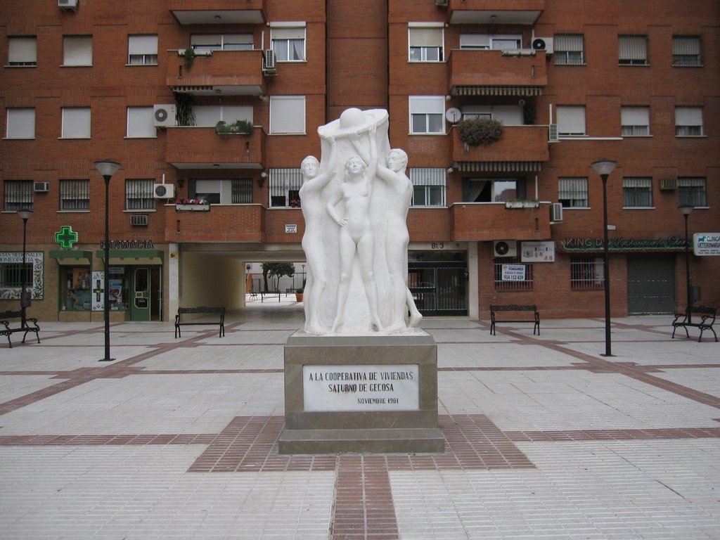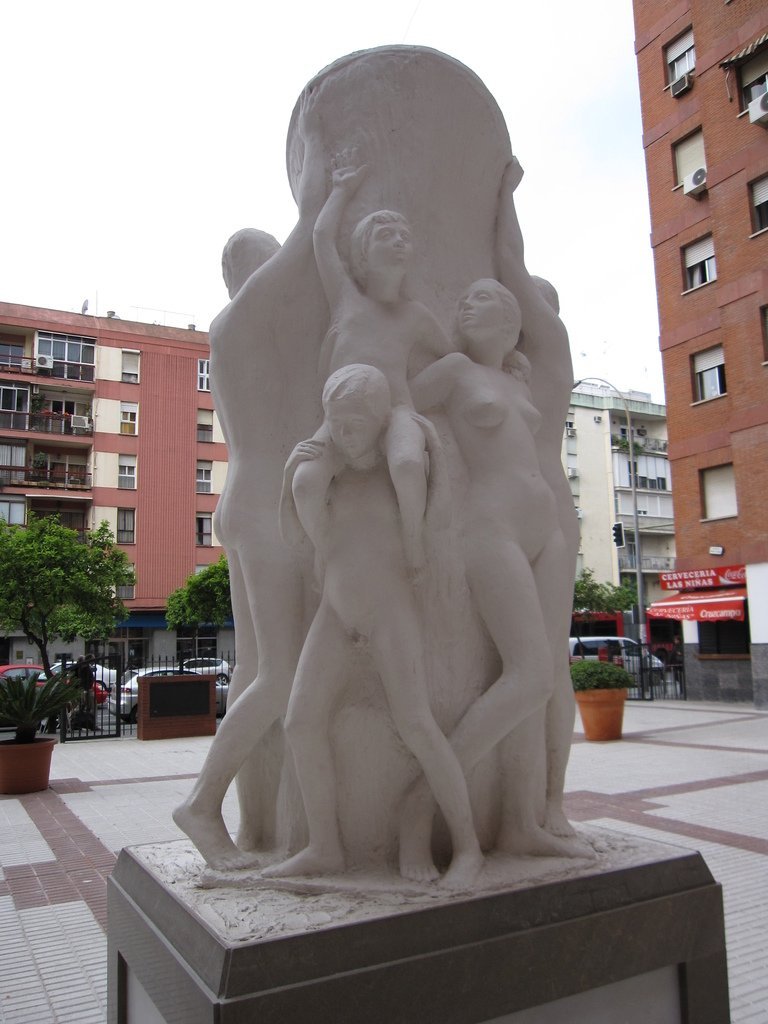 Escultura realizada en piedra caliza. Representa un grupo de seis figuras masculinas, femeninas e infantiles en distintas posturas y actitudes. Éstos sostienen entre sus manos al planeta Saturno. Se dispone sobre un pedestal de granito.