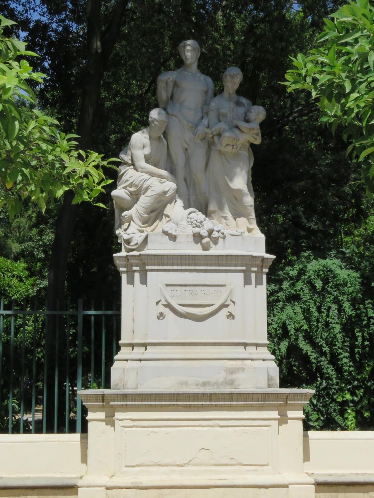 El Trabajo muestra un hombre en pie, una mujer en reflexión y otra figura también femenina que lleva un niño entre sus manos, representando cada uno respectivamente la vida activa, la contemplativa y los frutos del trabajo, y también se puede observar un cuerno de la abundancia vertiendo sus frutas sobre el pedestal.