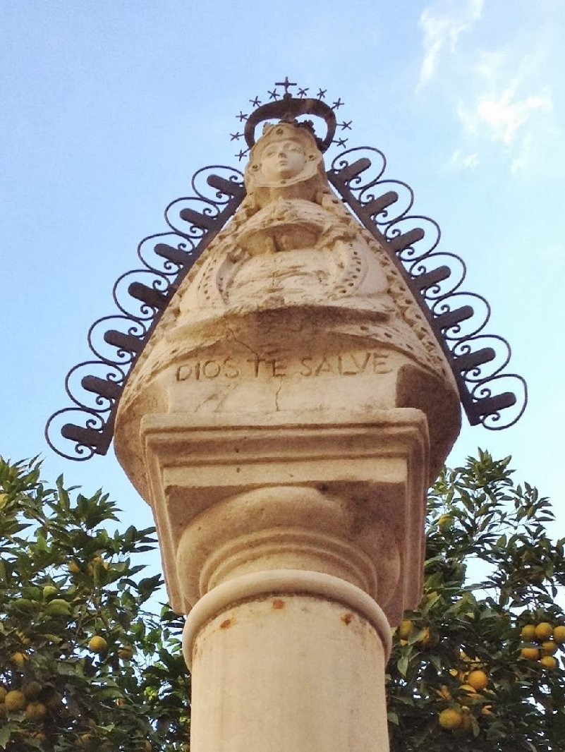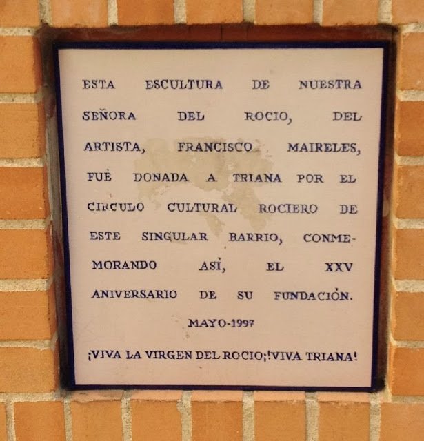 Monumento a la Virgen del Rocío que se compone de una pequeña imagen de la Virgen realizada en piedra caliza con aplicaciones de bronce (corona y ráfaga). La escultura se sitúa sobre una columna, a modo de triunfo, que se alza sobre un pedestal de ladrillo visto rodeado por una verja de hierro. Se trata de una réplica del Monumento de la Coronación, que se encuentra en Almonte y se realizó en 1920, un año después de la Coronación Canónica de la Virgen del Rocío.